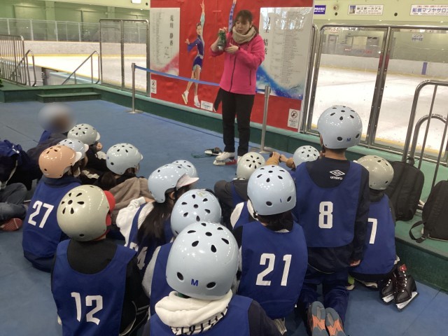 スケート靴の履き方や、転んだときの立ち上がり方、いろいろな滑り方を教えてもらいました。