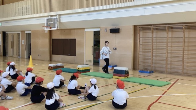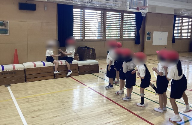 第1時間目は3クラス合同で行い、跳び箱をまたいだり跳び乗ったり跳び越えたりと、どんな動きができるか考えながら活動し、友達と楽しく遊ぶことができました。