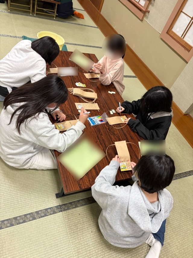 5年生ウィンタースクール2日目の夜は、米袋作り、はがきを書く、お土産購入の時間でした。