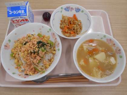 三色丼・田舎汁・切り干し大根の含め煮・巨峰・牛乳