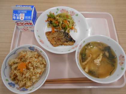 もみじご飯・芋の味噌汁・魚のごまつけ焼き・おかか和え・牛乳