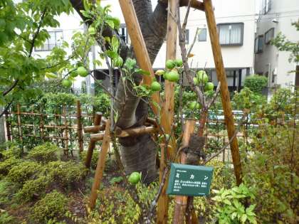 プレイコートには各学年・すみれ学級の菜園があります。その近くを見てみると、小さいけれど「ミカン」の木があります。「実りの秋」です。