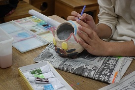 色をつけた作品に次は釉がけをして、学校の陶芸窯で1225度で焼成します!