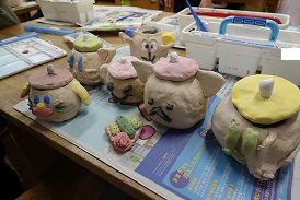 中を空洞にしたまん丸ねん土が、子供たちのアイディアで様々なステキな形に変身しています。小物入れやペン立て、おやつ入れなど、ふたをつけたり、取っ手をつけたり、使いやすさや丈夫さにも気を付けて工夫しています。