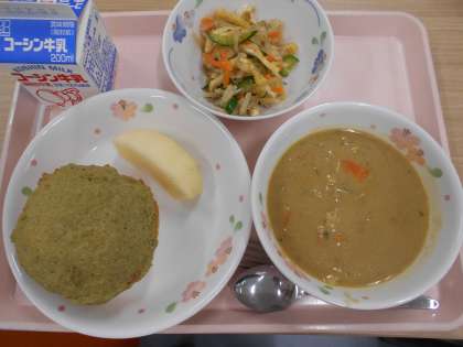 小松菜ビスキュイパン・カレーシチュー・大根サラダ・りんご・牛乳