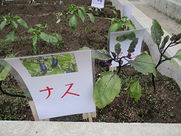 すみれ学級の畑に、立て看板を作りました。野菜ごとに、絵を描いて分かりやすくしました。