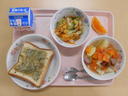 今日のメニューは、牛乳・じゃこのマヨネーズトースト・ポトフ・れんこんチップスサラダ・清見オレンジでした!
