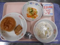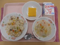 5月28日の給食です。今日のメニューは、牛乳・小松菜とコーンのピラフ・豆乳スープ...