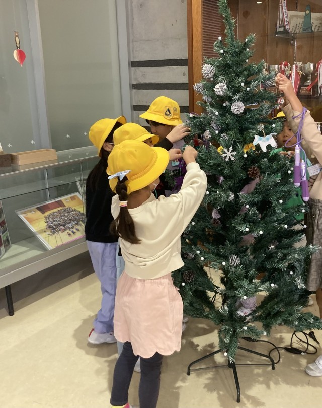 そして、保健室の前に置いてあるクリスマスツリーに飾り付けをしました。来校された際にぜひ御覧になってください。
