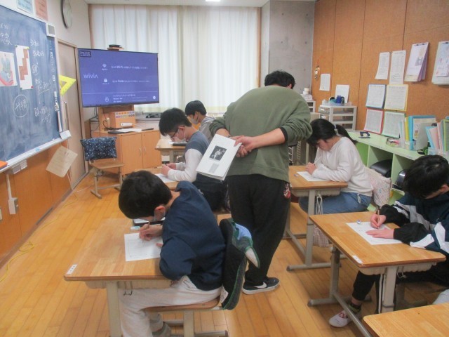 12月24日(水)に通常学級の担任が、あすなろ学級で道徳科の授業を行いました。学習では、伊能忠敬に関わる教材を用いて、努力を続ける強い意志と実行力について考えました。子供たちからは、「あきらめない」、「がんばる」などの言葉や「自分は○○○を頑張りたい。」などの目標が聞かれました。