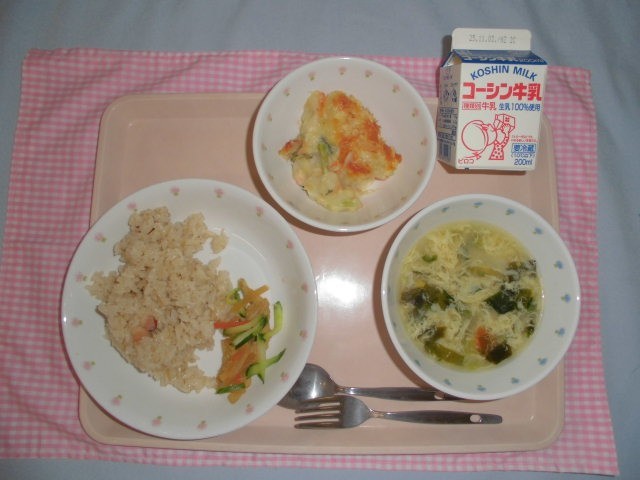 ・きのこのピラフ 牛乳 わかさぎのマリネ 鮭と芋とパスタのグラタン たまごスープ です。