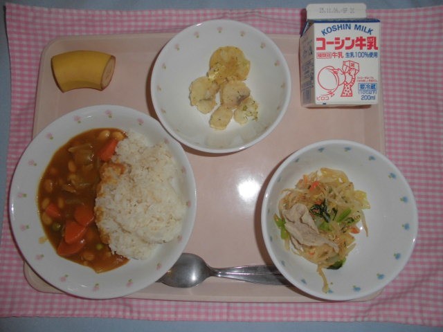 ・きのこのカレーライス 牛乳 フィッシュアンドチップス スタミナサラダ バナナです。