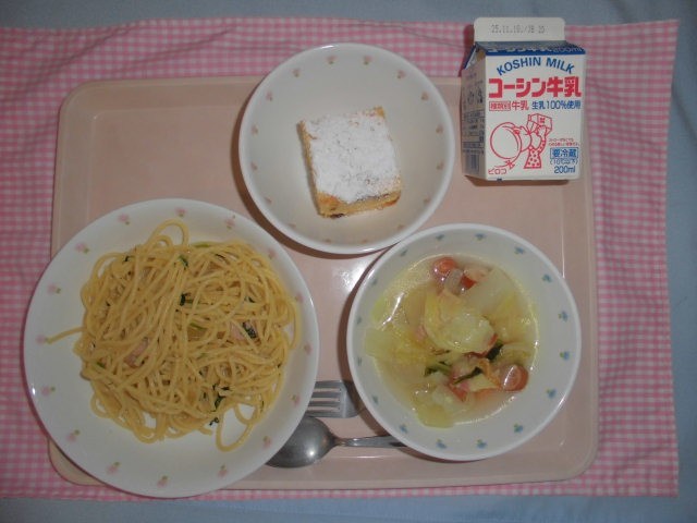 ・小松菜のペペロンチーノ 牛乳 野菜のスープ煮カレー風味 かぼちゃのケーキ です。