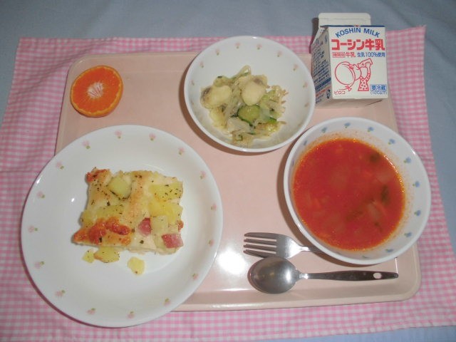 ・じゃが芋おかずフォカッチャ 牛乳 ABCミネストローネ フィッシュサラダ 菊花ミカン です。