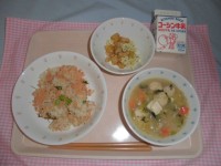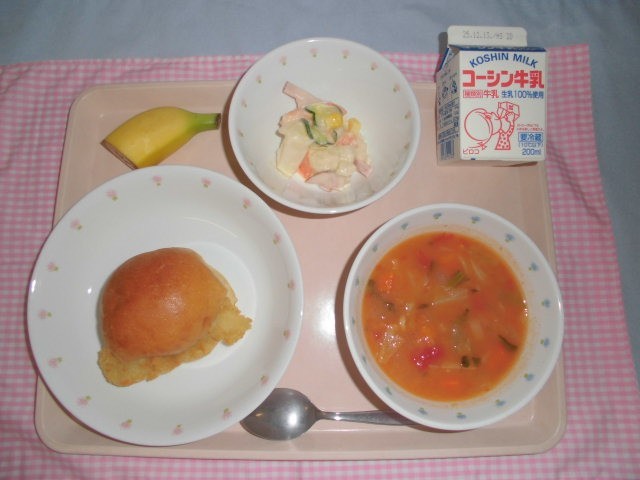 ・フィッシュバーガー 牛乳 ポテトサラダ レンズ豆のミネストローネ バナナ です。