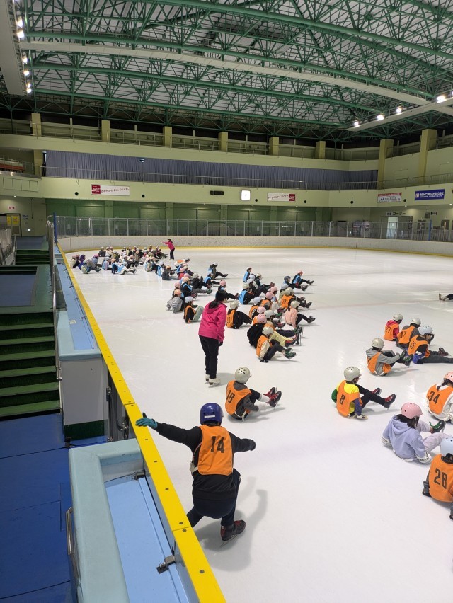 スケート教室、立ち方の練習です。みんな上手です。