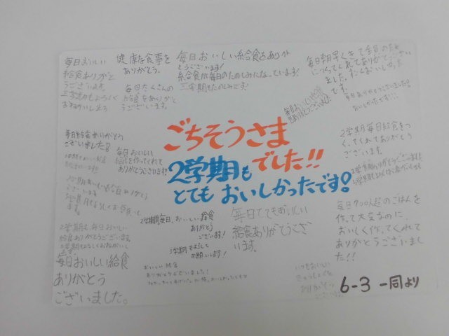 2学期最後の給食です。クリスマスを意識して、とり手羽元の骨つき肉を甘辛く煮ました。ほろほろと肉が骨からとれるくらいに良く煮ました。