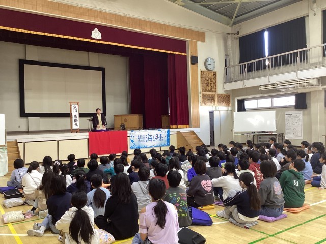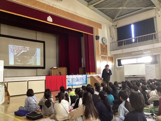 日本財団「海と日本プロジェクト」井手迫先生と落語家の立川志獅丸さんをゲストティーチャーとしてお呼びし、海に捨てられているプラスチックごみが生き物にどんな影響をもたらしているのか、落語とスライドを使って教えていただきました。
