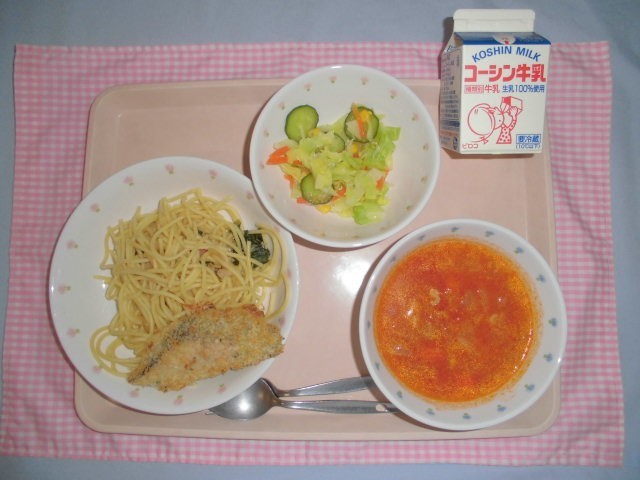 ・小松菜のペペロンチーノ 牛乳 魚のカレーマヨネーズ焼き コーンサラダ 大豆入りミネストローネ です。