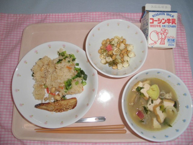 ・節分ご飯 牛乳 イワシのかば焼き さつま汁 ポリポリ鬼うち豆 です。
