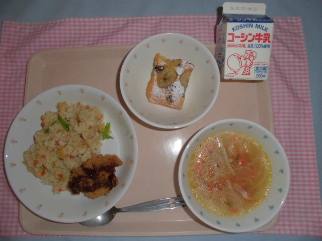・コーンピラフ 牛乳 レバーカツ ジュリエンヌスープ チョコバナナケーキ です。