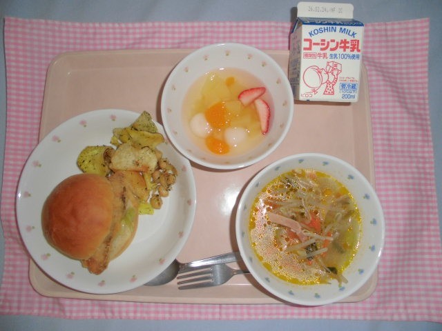 ・サケのフィッシュバーガー 牛乳 ミックスチップス もやしとハムのスープ 白玉フルーツポンチ です。