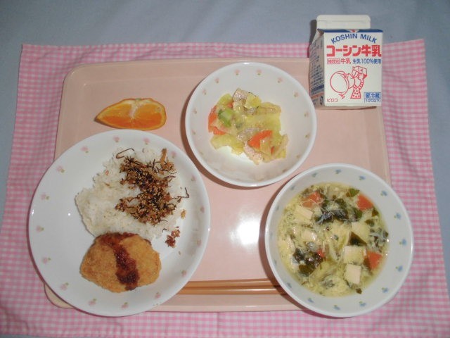 ・ごはん 手作りふりかけ 牛乳 さつま芋のコロッケ 和野菜和え かきたま汁 デコポン です