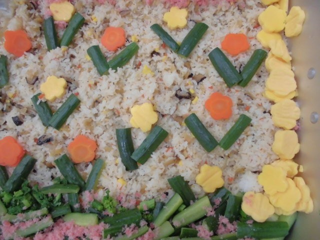 ひな祭りの華やかな行事食です。工夫して配缶をしました。酢飯の苦手な低学年の子どもも多いようですが、がんばって食べていました。