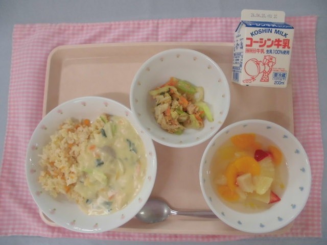・キャロットライスのクリームソースかけ 牛乳 小松菜サラダ フルーツポンチ です。