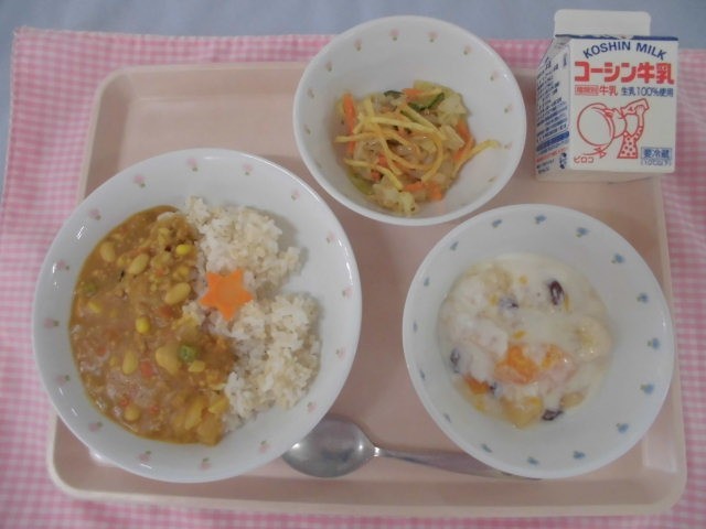 ・星のカレーライス 牛乳 カリカリポテトサラダ フルーツヨーグルト です。
