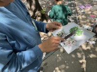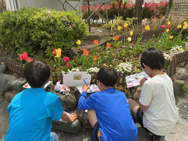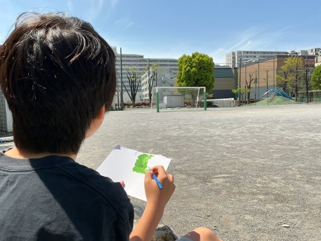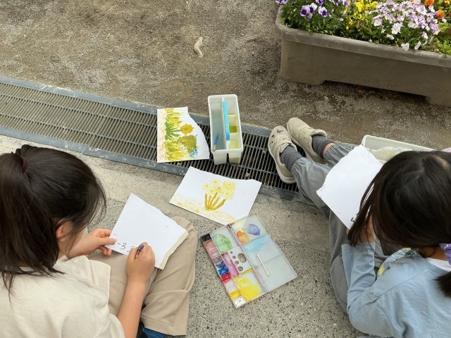 絵の具セットを持って校庭に出かけ、それぞれが見つけた春をスケッチしています。