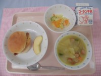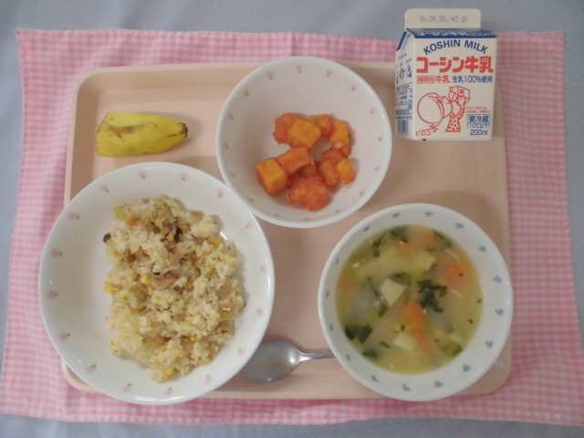 ・チャーハン 牛乳 えびといかのチリソース 中華コーンスープ バナナ です。