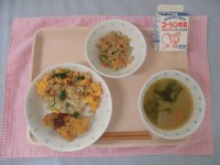こんにゃく、白菜を炒めてみそ味にしたものをご飯にかけます。