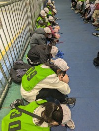 7時からスキー靴の大きさを合わせたり実際の履き方を習いました。そして、朝ごはんです。午前は雪上運動会、頑張りましょう。