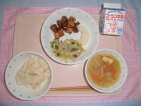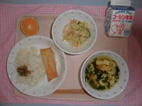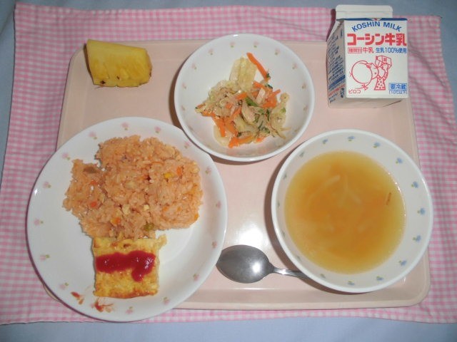今日のこんだては…・チキンライス 牛乳 ツナとポテトのオムレツ 小松菜サラダ ジ...