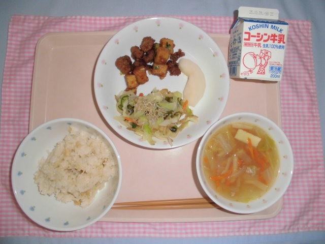 今日のこんだては…・鶏ご飯 牛乳 レバーの甘辛ソース じゃことごぼうの和え物 太...