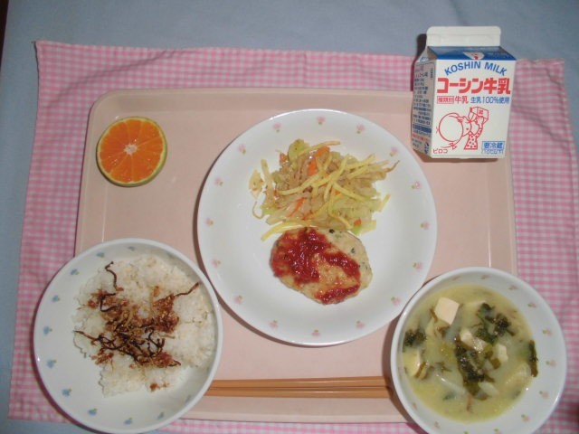 今日のこんだては…・ごはん カルちゃんふりかけ 牛乳 豆腐のハンバーグ カリカリ...