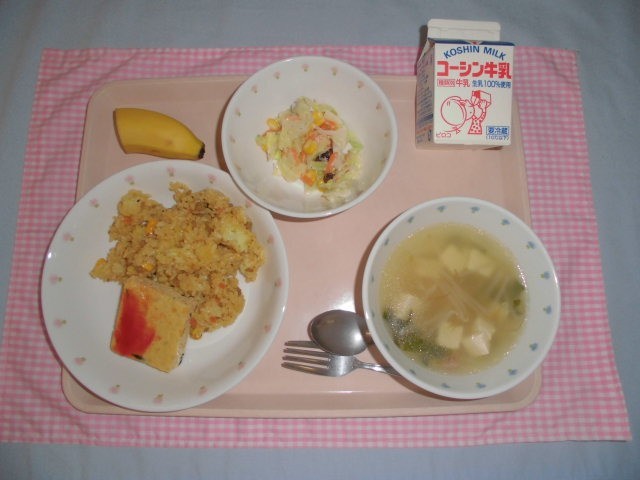 今日のこんだては…・ピラフタイプのドライカレー 牛乳 ひじき入りオムレツ コール...