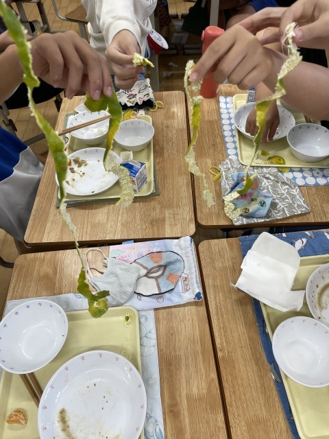 6年生は、とても器用にみかんの皮をむいて、長さ比べをしていました♩