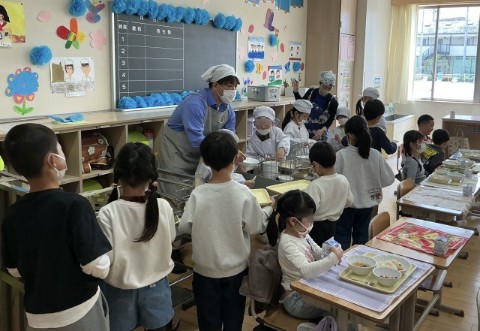 白衣を着て、給食当番もスタートです。