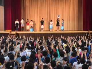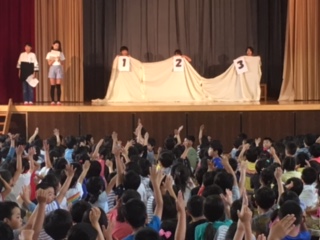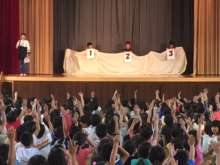 ゲーム集会がありました。重そうな荷物を本当に持っているのは誰か、本当に空気椅子に座っているのは誰か、本当にくすぐられているのは誰かを当てるクイズでした。集会委員の子の演技が上手で難しかったようです。