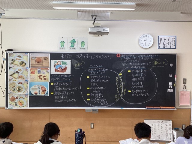 道徳科の価値項目「国際理解・国際親善」をしました。主人公のマーサちゃんの行った行動と栄養士の松嶋先生の給食への思いを思考ツール「ベン図」を活用して行いました。何か自分でできることはないかと考えたり、松嶋先生のみんなに食べさせたいと考えていたりすることに触れました。自己の振り返りでは、誰かのためにと行動している人のおかげで生活できているのだと振り返り、国際理解へと理解を広げました。