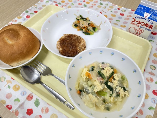10月7日 献立マーガリンパン牛乳アジのメンチカツ小松菜ともやしのソテーキャベツ...