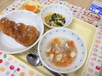 4月10日 献立マーガリンパン牛乳鶏肉のハーブ揚げコーンサラダ小松菜スープパンに...