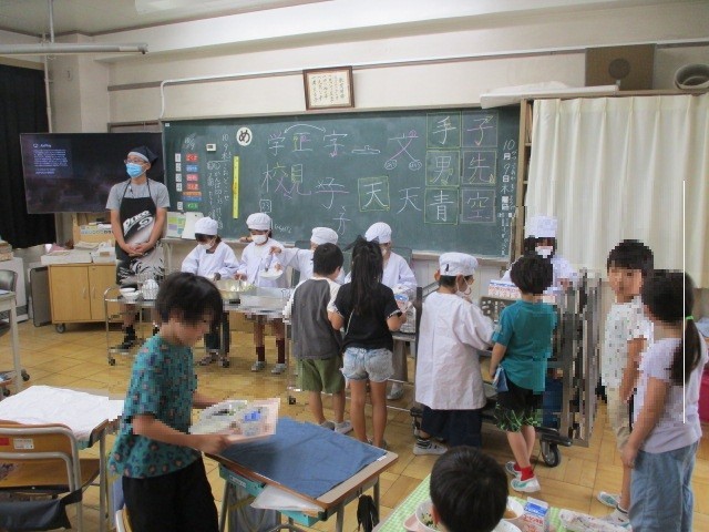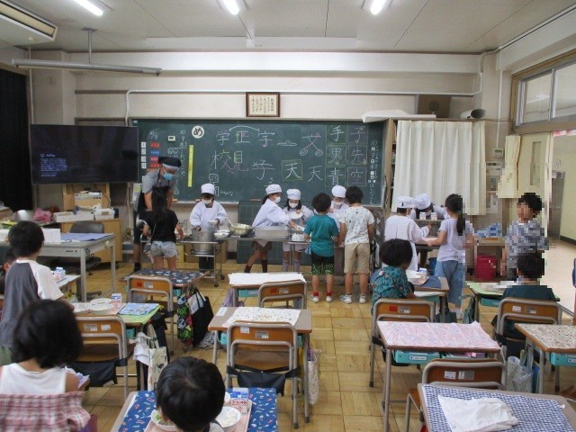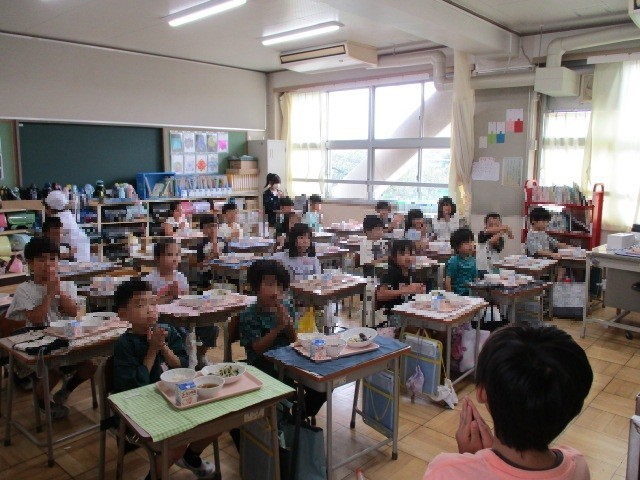 今日の給食は、ごはん、さんまの松前煮、きのことじゃこの和え物、かぼちゃのみそ汁、牛乳です。1年生も上手に準備できるようになりました。