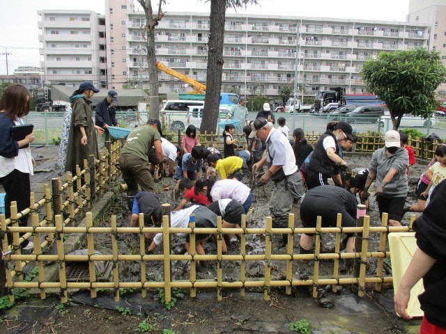10時前まで小雨でしたが、玄関で開会式を行い、蓮掘りを行うことが出来ました。
