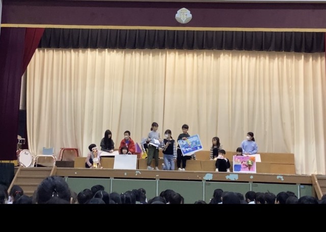 各学年の代表児童が、放送委員会の児童からのインタビューに答えながら、作り方や工夫したところをがんばって発表しました。
