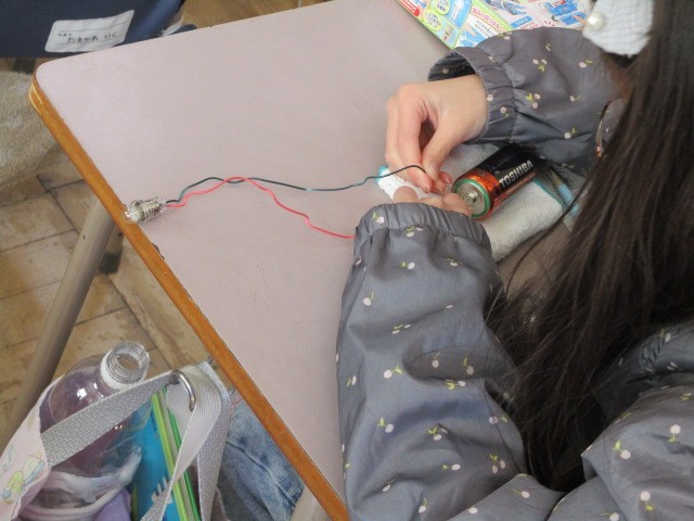 電気の通り道について学びました。乾電池と豆電球をどのようにつないだら明かりがつくのかをみんなで予想した後、各自で道具を使い、実験をして確かめました。