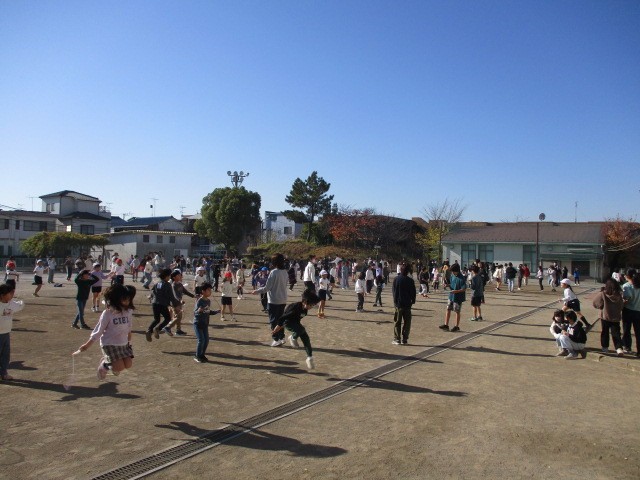 中休みの時間に、校庭で全校なわ跳びに取り組んでいます。