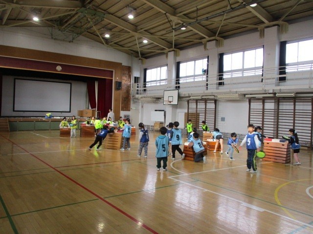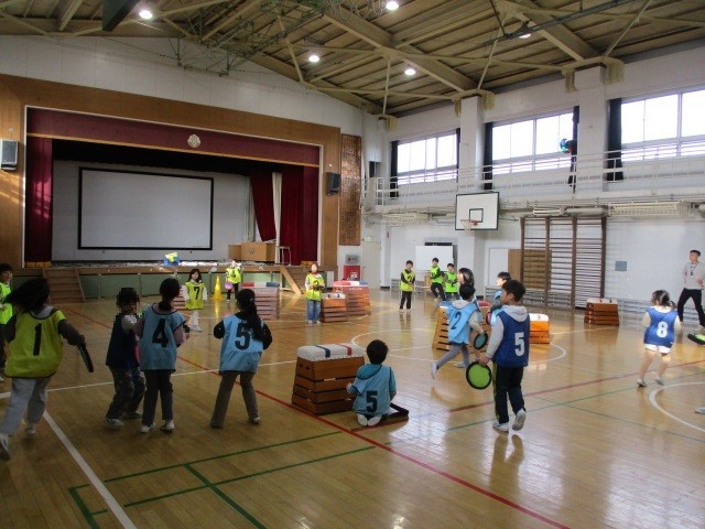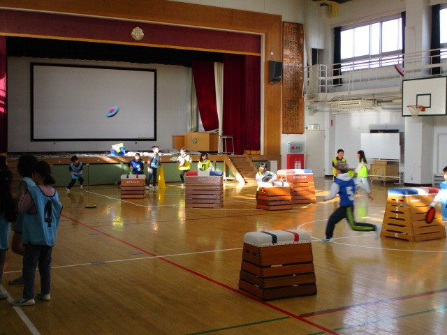 跳び箱の配置や作戦を考え、相手の陣地にあるカラーコーンを取り合いました。